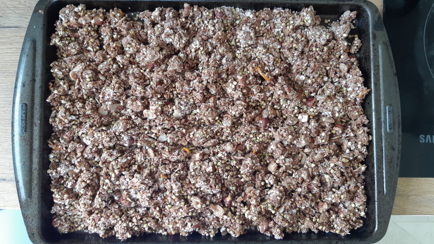 Start by chopping the nuts. Then mix the oats, buckwheat, chia seeds, zest and nuts together in a bowl. Cut up the dark chocolate into small pieces and put in a heatproof bowl/sauce pan. Pour the oil over the chocolate and melt together either in the microwave in 10 seconds intervalls or on the stove on low heat. One the chocolate is completely melted add the syrup and orange juice to it and stir until everything is fully incorprated. Next pour the liquid mixture over the dry and stir until everything is covered.