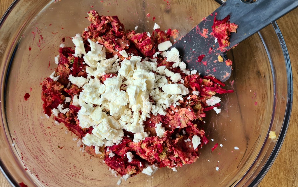 Lastly mix in the beetroot and feta. Pour some of the extra panko on a plate. Separate the burger mix into four equal pieces and roll them into balls. Take one of the balls and lightly press down into the panko until it resembles a burger patty. flip it and lightly press again so it ends up being covered in panko. Repeat the process with the rest of the patties. Let the chickpea and burger patties rest in the fridge for at least 4 hours. I like to prepare these the night before.