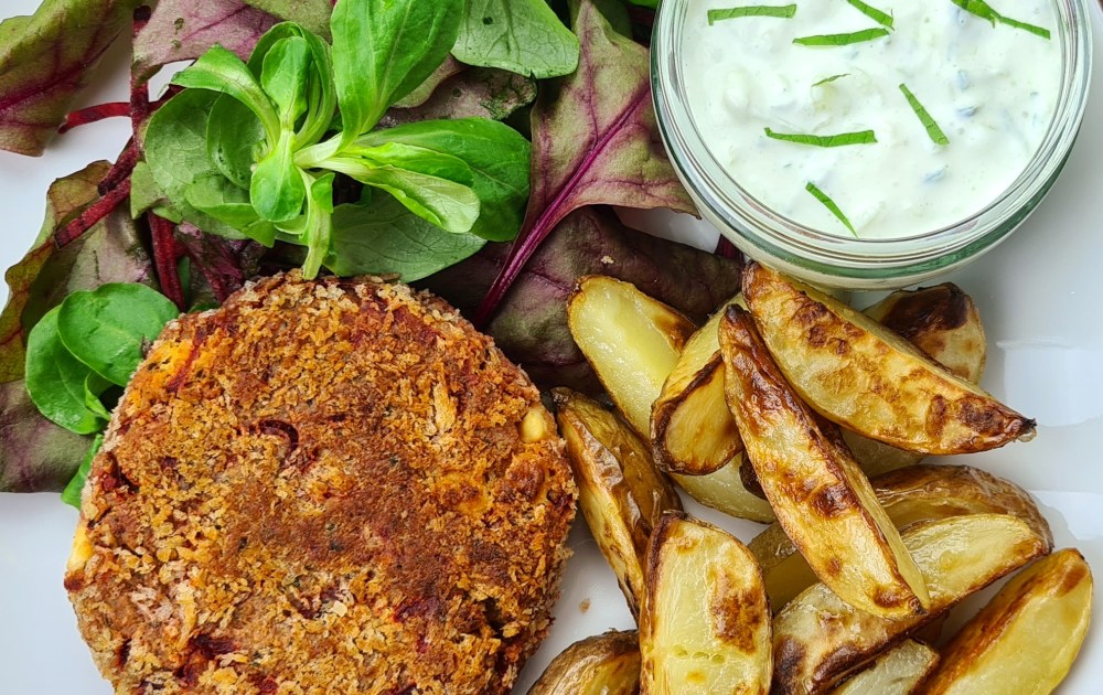 I have made these chickpea and beetroot burgers several times now. I made a similar version at work once but there were a few ingredients I didn’t like and so have made a few adjustments and made them my own. The vegetarian burgers have become a permanent dinner staple in our household and were approved at a small dinner gathering with family recently so I thought I’d share the recipe. Now as you can see in the photo above I serve my burgers naked but they are firm enough if one were to choose to put them inside a bun. I just find them a bit lighter without the bread. Shall we get on with the recipe then!
