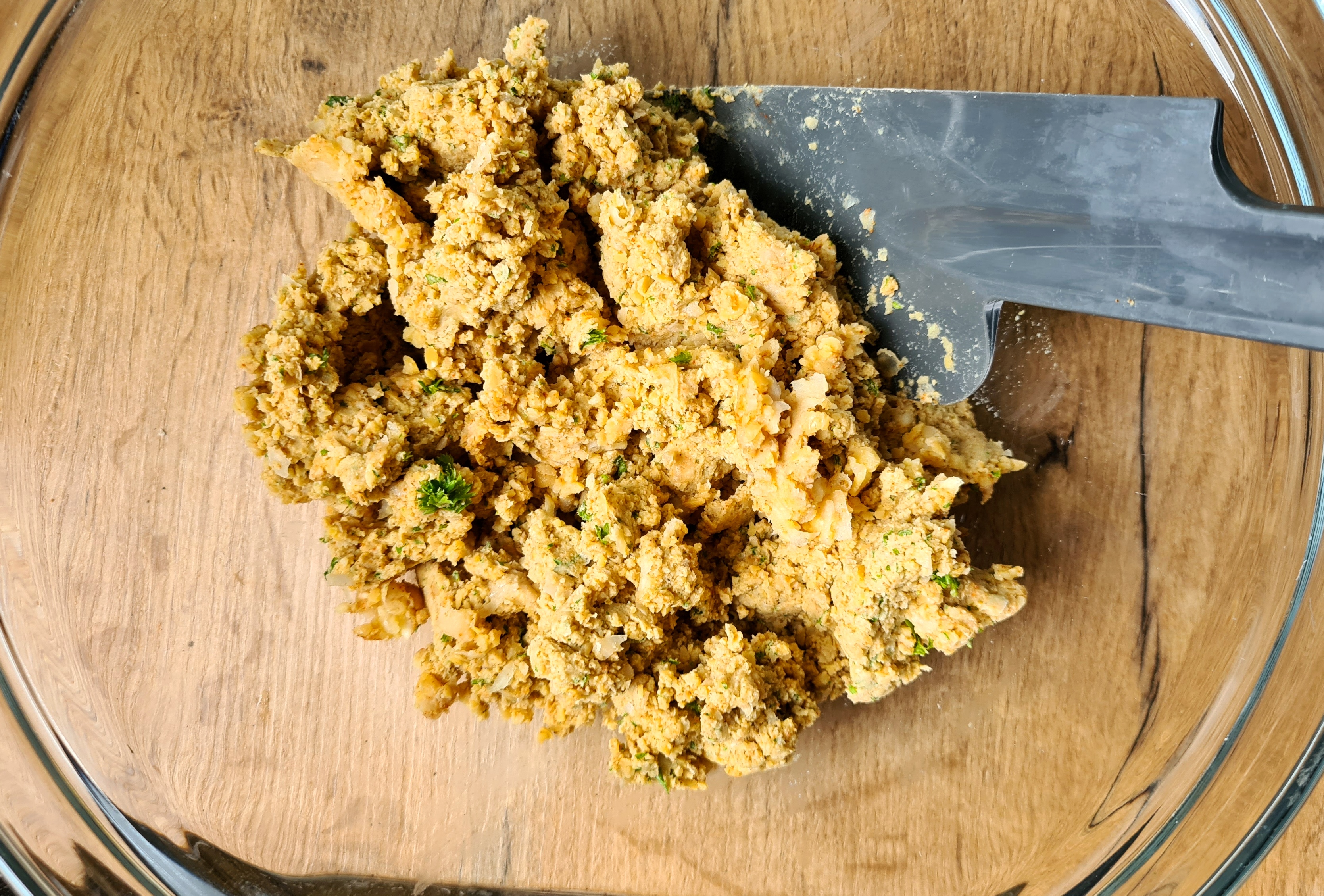 Start by pulsing the chickpeas in a food processor until almost smooth. Add the onion, garlic, tahini, parsley and spices and pulse a few more seconds until everything is incorporated. Transfer to a bowl and add the egg and mix. Next mix in the panko.