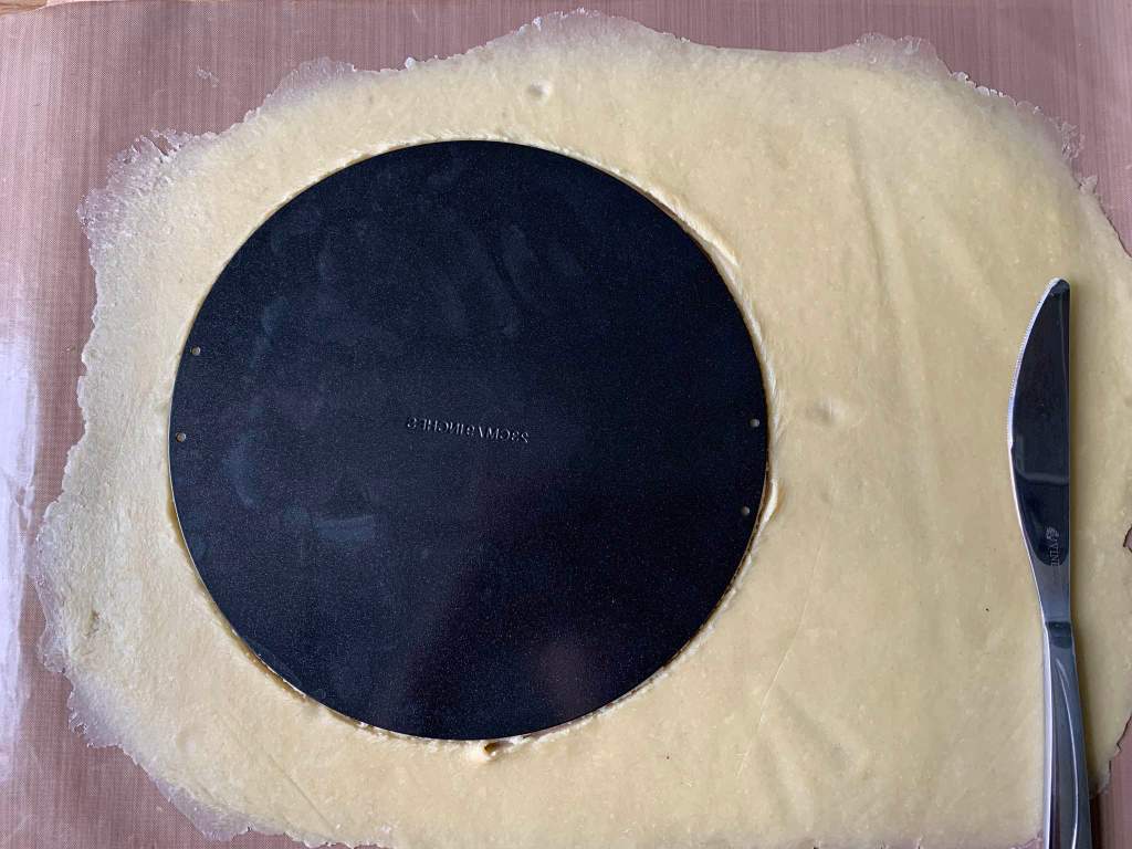 Chill the dough for at least an hour, then roll it out thinly. When it’s time to fit the dough into the tart tin, I’ve found a method that works consistently well for me. First, I place the loose bottom of the tin on the cold dough and cut around it (if the dough has become too soft, refrigerate it briefly). Next, I cut thin strips from the remaining dough and use them to assemble the edges of the tart, creating an even layer all around.