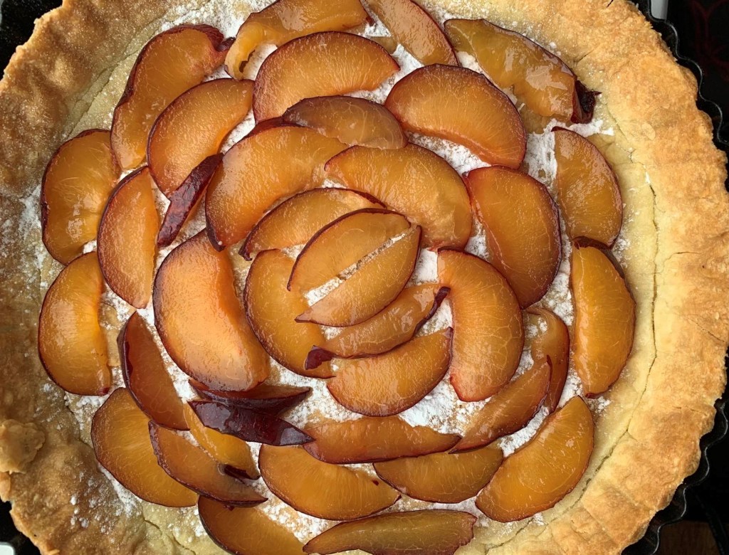 Now pour the filling over the plums and use a palette knife to even it out. Here comes the fun part – arrange the plum slices in a circular pattern, starting from the outer edge of the tart and working your way towards the center.